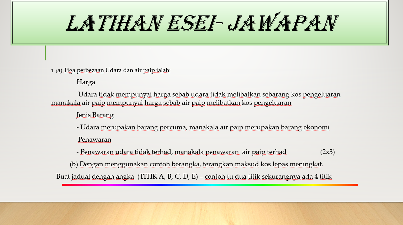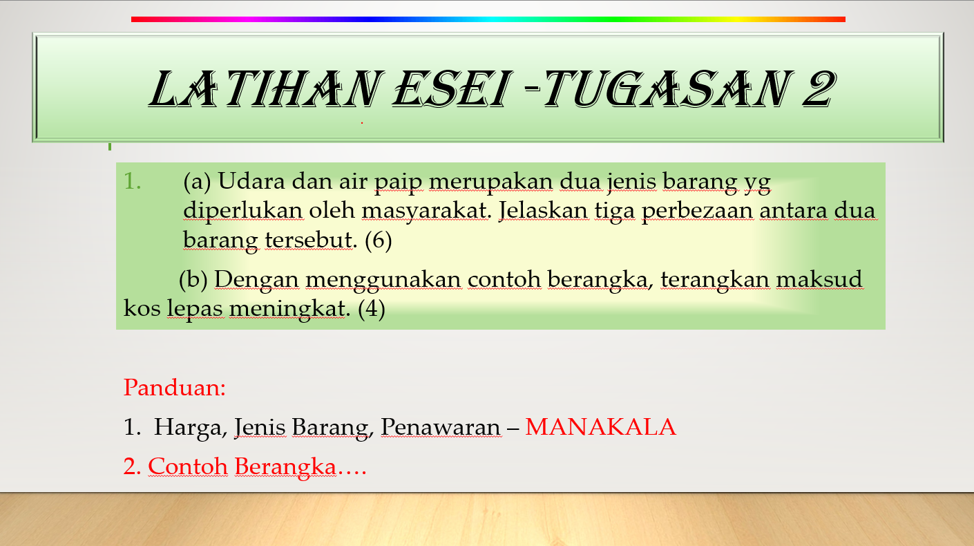 | Barang percuma (udara, air hujan, cahaya matahari) | Barang Awam (bomba, polis, rumah api) |